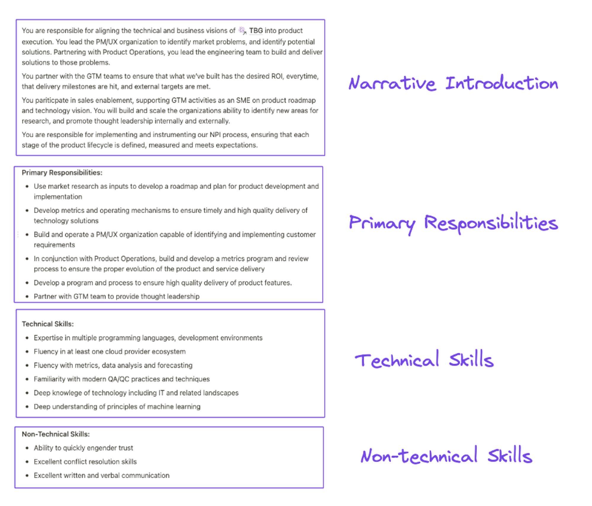 While the narrative structure talks about the role in the organization's structure, the primary responsibilities are a bulleted list of what the person in the role needs to do to succeed. This list is in order of importance. Each bullet should capture one fundamental action or deliverable in a tangible way. They must be structured so that you can reasonably imagine sitting with a team member who is looking to get promoted and say "Yes…Yes…no on this one…Yes…Yes".
