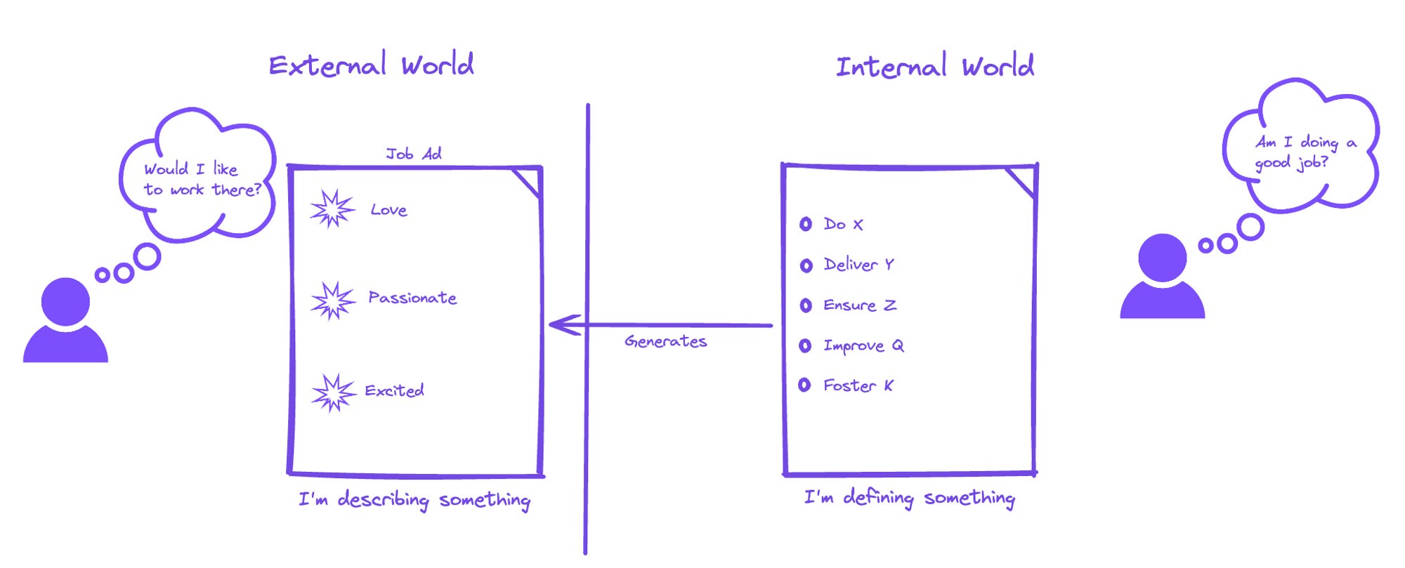 A Job Ad, by contrast, is a document that describes what it would be like to do the role of a person who isn't inside your company, hence the term "ad." The language in a job ad is evocative and emotive. If done well, they can give a prospective candidate a feeling about what it might be like to work in the organization.